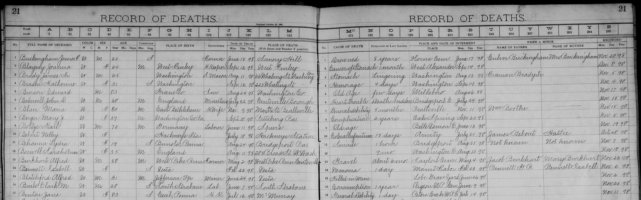 Washington County, PA Death Records, 1893 - 1906, Vol 1, page 21